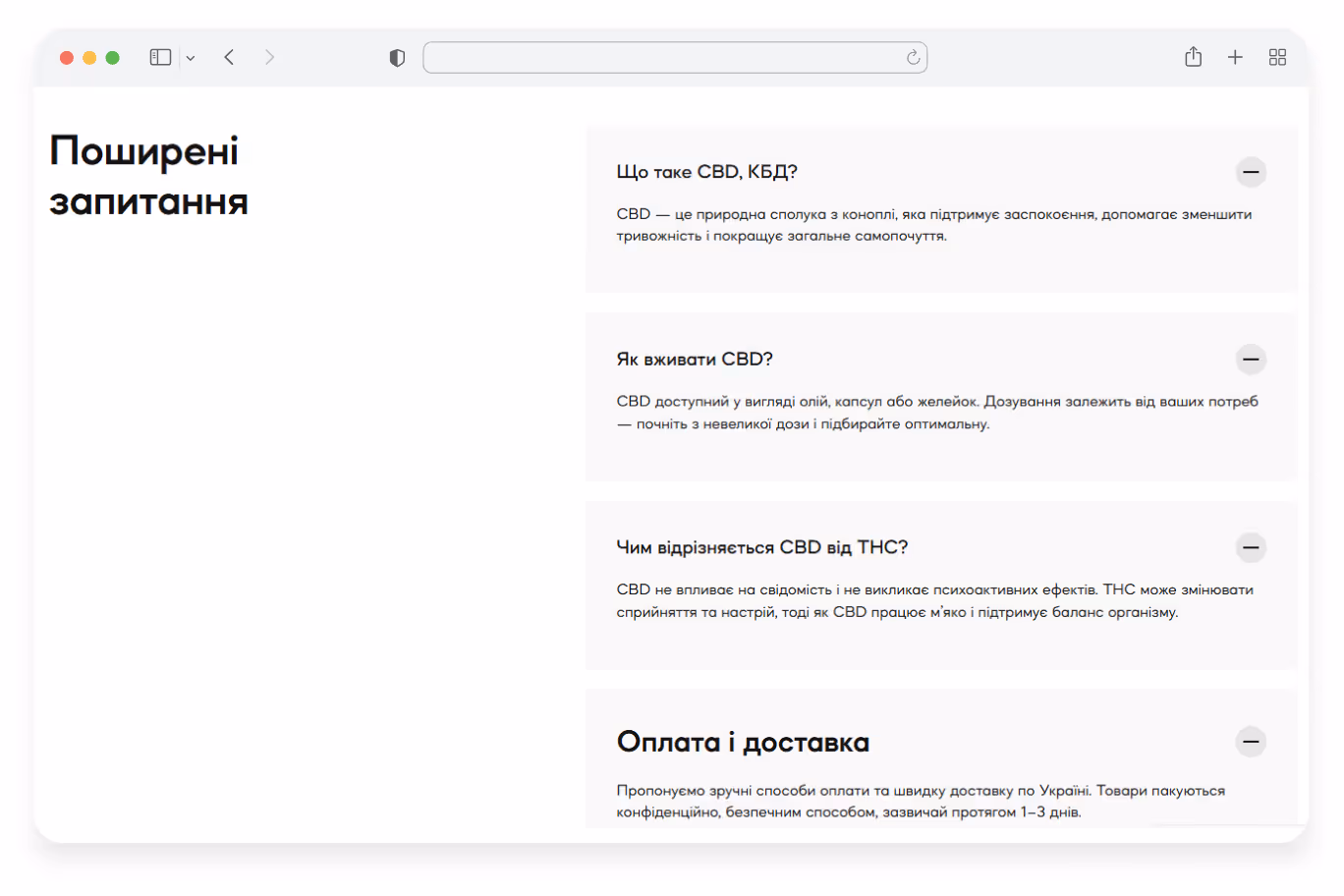- Не забувайте про FAQ-блоки — короткі відповіді на поширені питання.