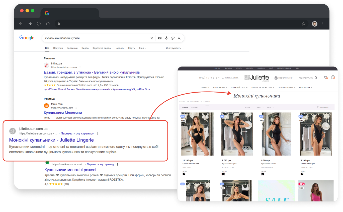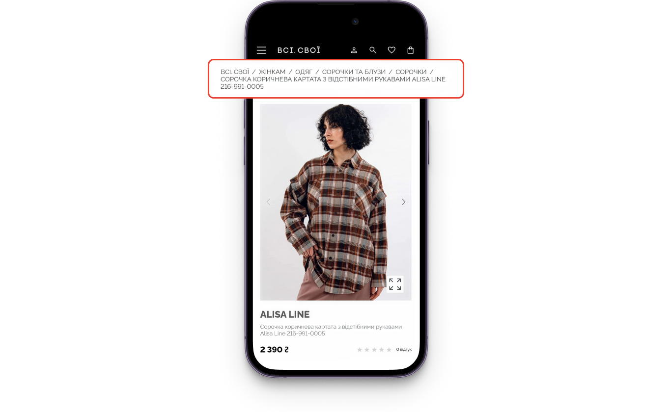 - Чітке позиціонування: назва сторінки (наприклад, «Жіночий одяг» або «Сукні») вказує, де саме перебуває користувач у структурі сайту.