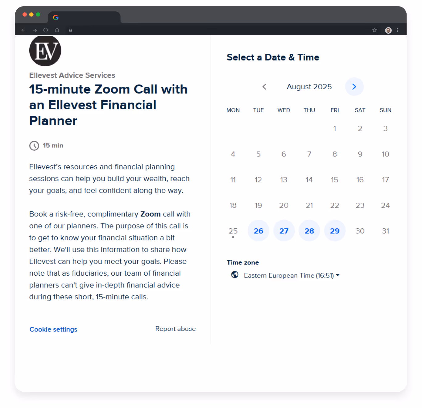 Цей вебдизайн ставить клієнтів на перше місце: він чітко відображає тривалість дзвінка, часовий пояс, доступні слоти та мету зустрічі. Інтерфейс уникає зайвих кольорів або елементів, дозволяючи користувачеві зосередитися на основній дії — купівлі послуг компанії.