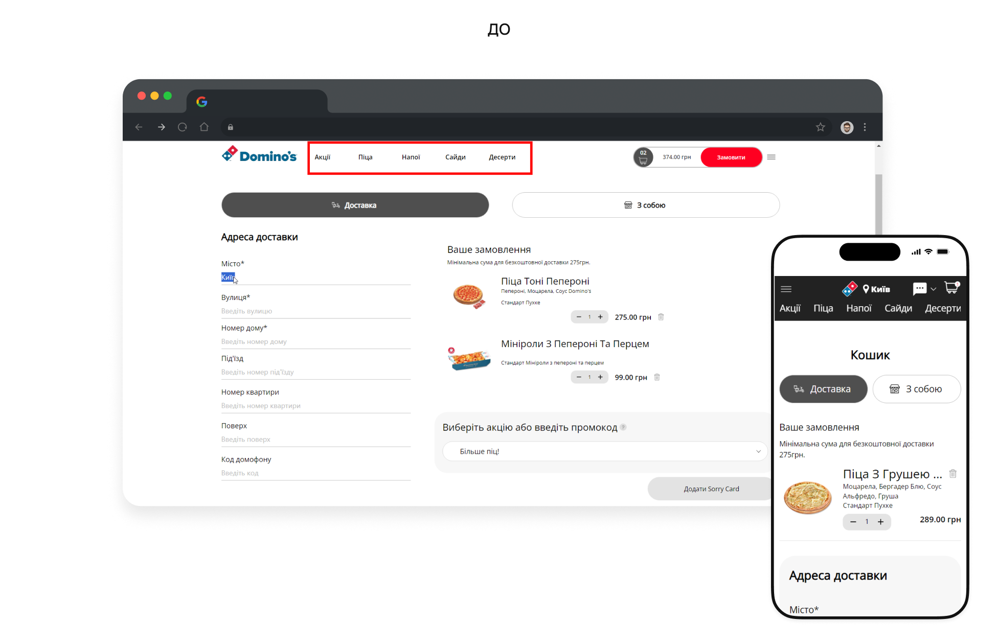 - Поліпшити досвід мобільного замовлення, не порушуючи звичних паттернів (mobile-first).