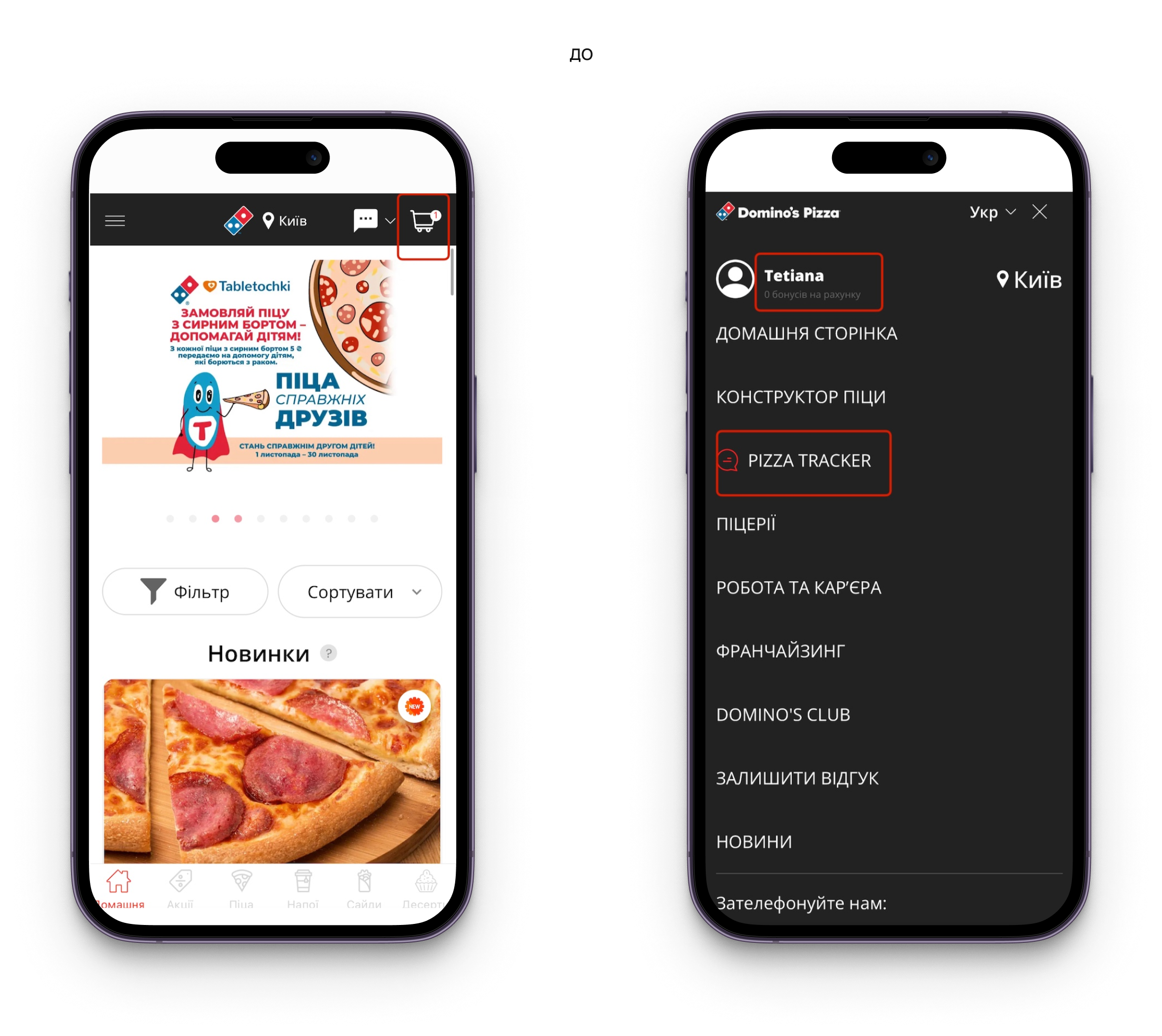 До: Іконка кошика знаходилася у верхньому куті, куди важко дотягнутися однією рукою і яку легко не помітити. Користувачі, що повернулися, не мали можливості швидко повторити попереднє замовлення або відновити покинуте, що змушувало їх збирати кошик заново вручну. Бургер-меню було перевантаженим, приховуючи важливі інструменти, як-от «Бонуси» та «Трекер».