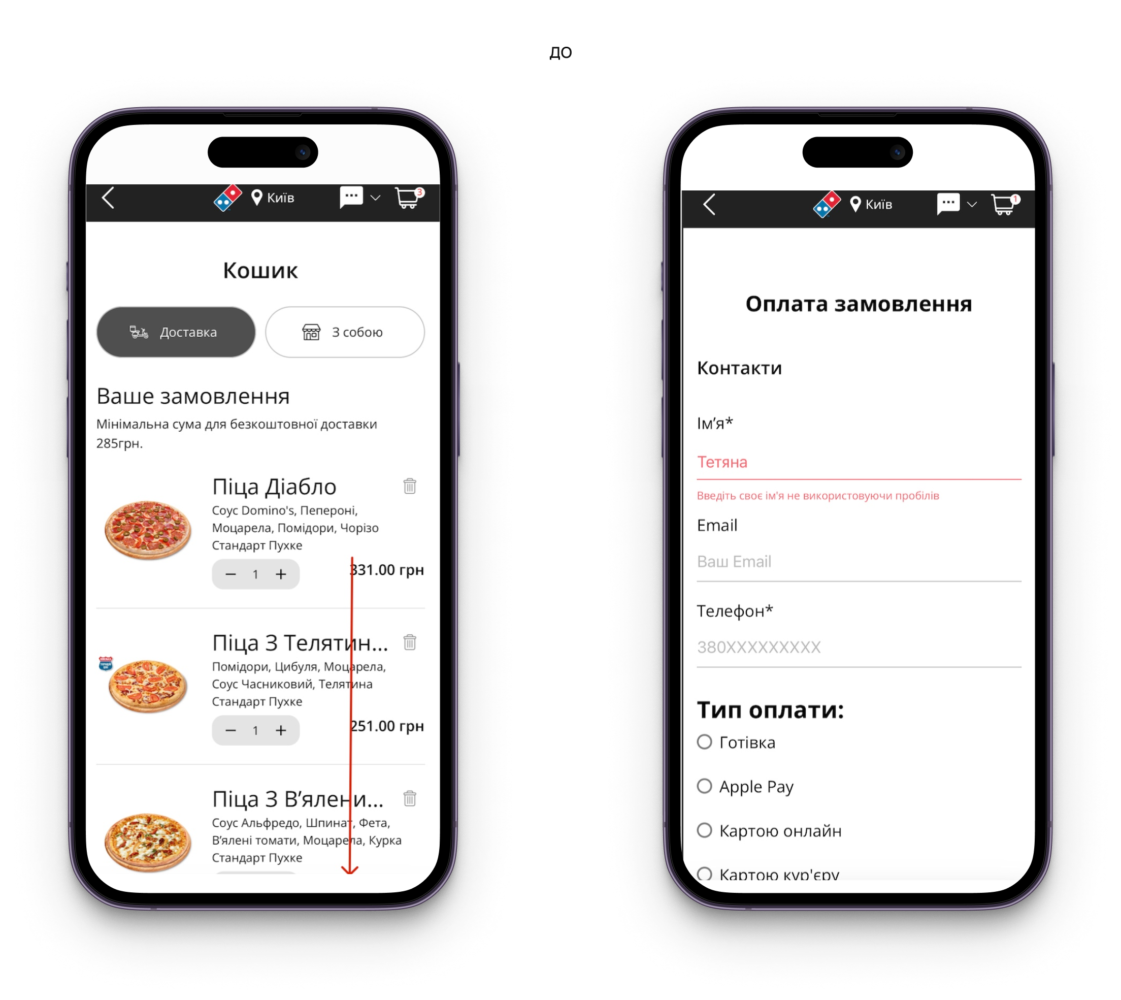 До: Користувачам доводилося скролити до самого низу, щоб побачити загальну вартість. Були відсутні пропозиції крос-сейлу для напоїв чи соусів. Товари зі знижкою не виділялися, через що користувачі сумнівалися, чи спрацював промокод. Помилки чекауту, спричинені автозаповненням, було важко виявити, що блокувало завершення замовлення.