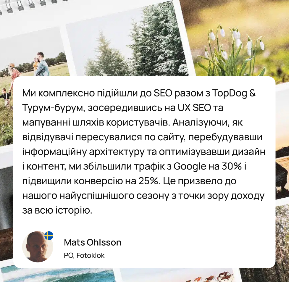 Ці результати стали можливими завдяки тісній співпраці: Fotoklok визначив концепцію, TopDog займався SEO та узгодженням плану дій, а наша команда перетворила все це на ефективний користувацький досвід.