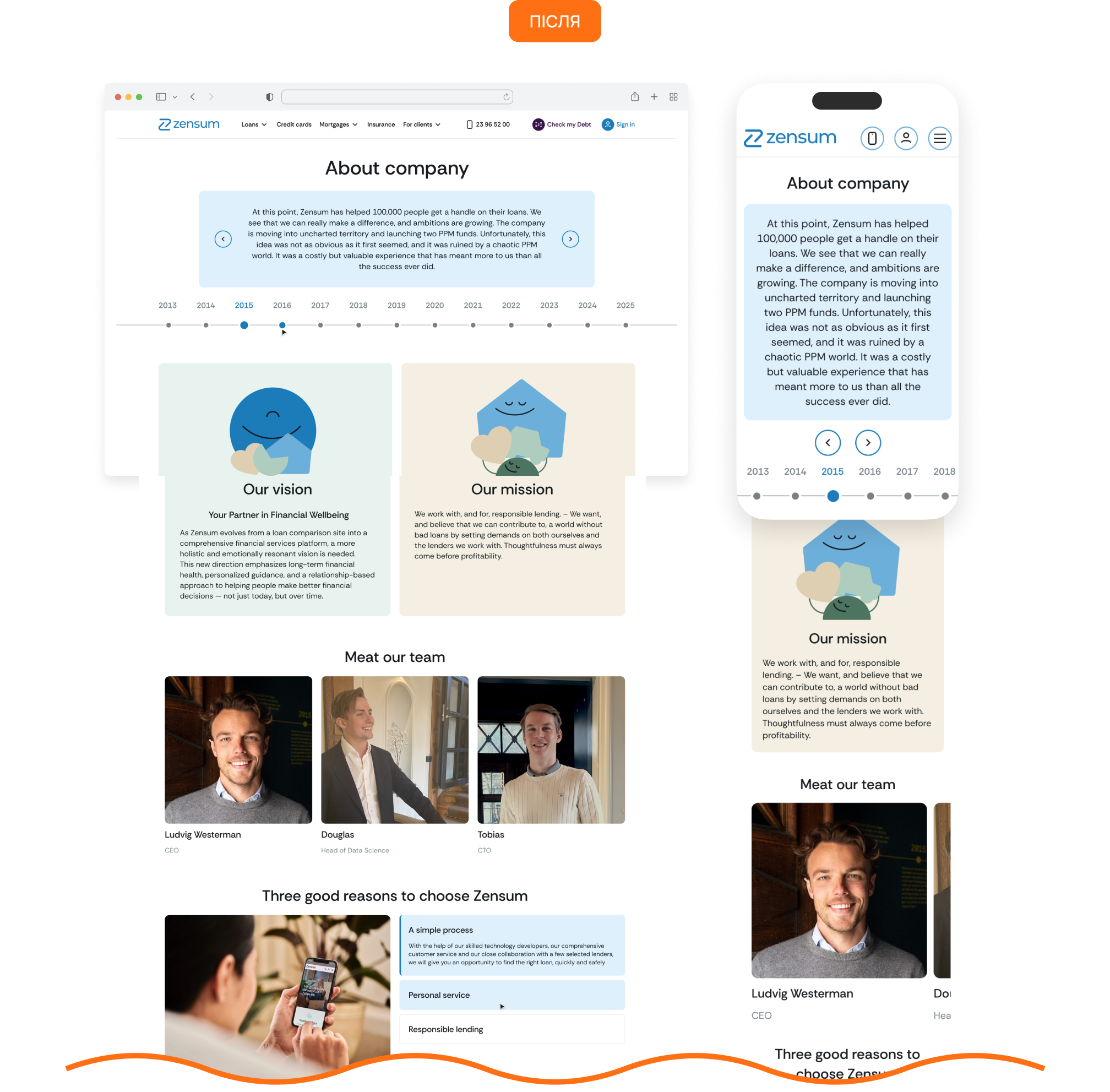 Після: контент був повністю реорганізований з чіткою ієрархією, слушними візуальними елементами та стислими, зручними для сканування текстами. Сторінки, що й досі генерують трафік, тепер також формують довіру, показуючи історію, людей та цінності Zensum у зрозумілій та цікавій формі.