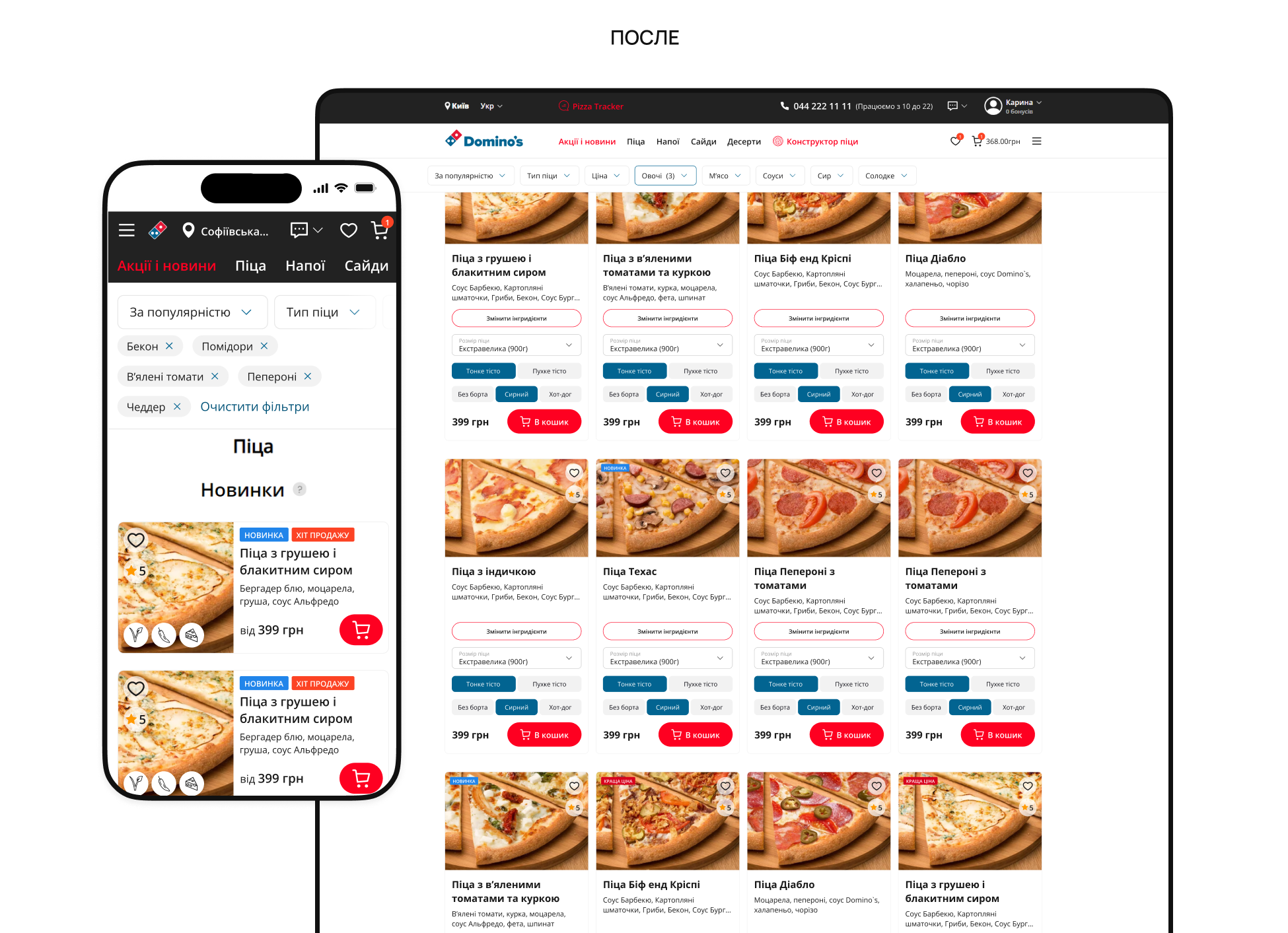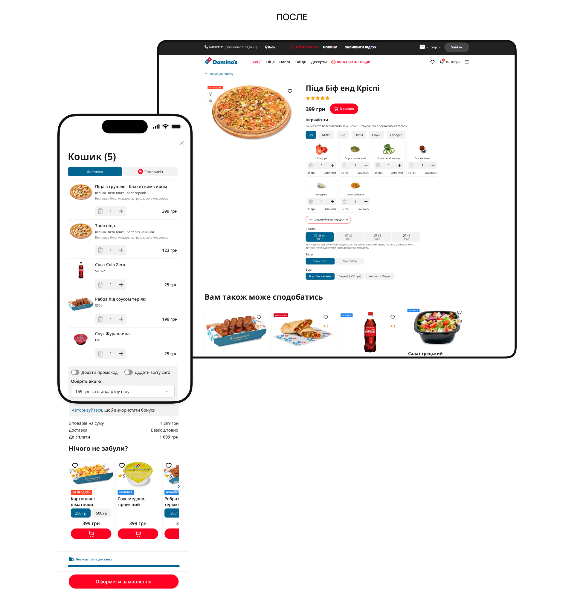 До: Лишь около трети пользователей добавляли товар в корзину со страницы товара. Цена и кнопка «Добавить в корзину» не были зафиксированы, «Конструктор пиццы» был скрыт в меню, не было cross-sell-блока для напитков или сайдов, а приоритетом было удаление ингредиентов, а не добавление дополнений.