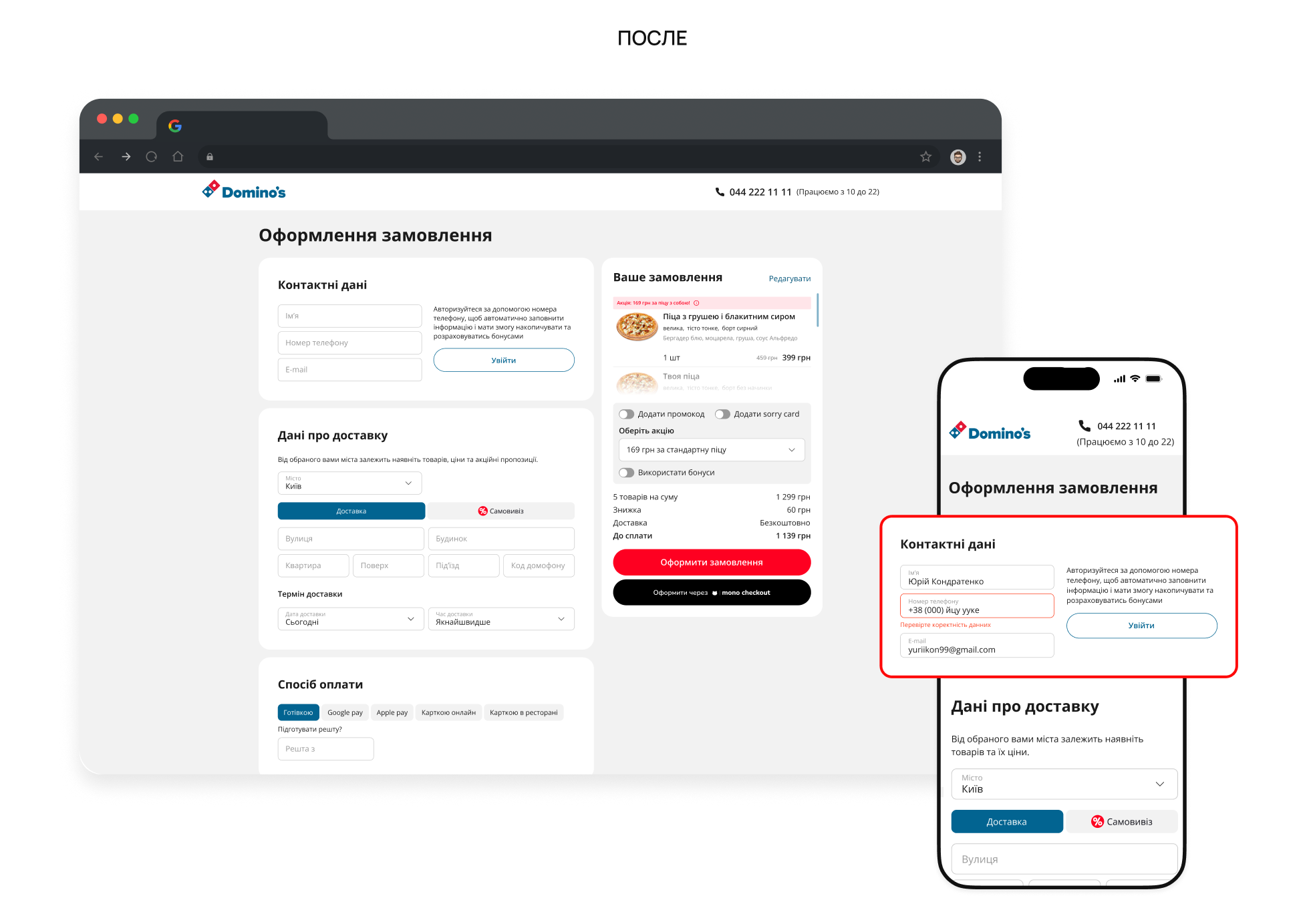 После: Добавили понятную информацию о доставке и оплате, а навигацию минимизировали, чтобы сосредоточить внимание на оформлении заказа. Также внедрили автоматическую прокрутку к полям с ошибками, чтобы пользователи могли быстро их исправить.