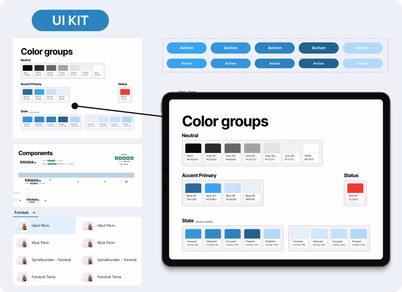 Дизайн ключевых страниц — лишь часть истории. Для того чтобы Fotoklok мог продолжать развиваться, не теряя идентичности бренда, мы также подготовили UI Kit. Он включает основные элементы, такие как типографика, кнопки, иконки, цветовые палитры и компоненты, которые можно использовать повторно — и всё это во всех возможных состояниях.