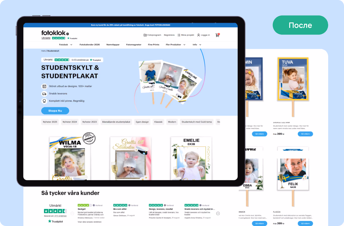 Возьмём, к примеру, Studentskylt. В Швеции выпускные таблички с детскими фотографиями — любимая традиция и символ взросления. Было необходимо переработать страницу так, чтобы она передавала это тепло и в то же время оставалась удобной для пользователей, оформляющих крупные заказы.
